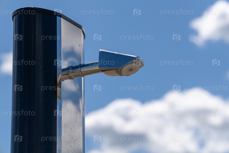 Ближайший снимок душного сопла на общественном пляже против ярко-синего неба с облаками.Полированная металлическая поверхность отражает солнце и окружающую среду
