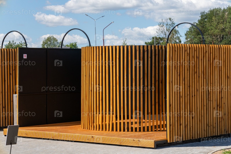 Современная открытая раздевалка с ярким дизайном с вертикальными деревянными лестницами и изогнутой стеной.Структура расположена на деревянной палубе под ярким солнечным небом