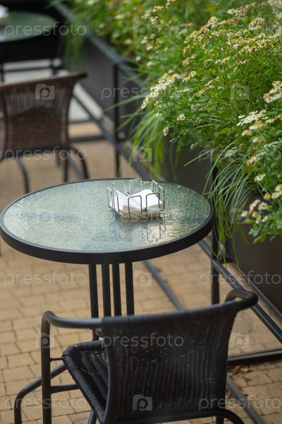 Стеклянный стол с стойкой для салфетки стоит на открытом дворе