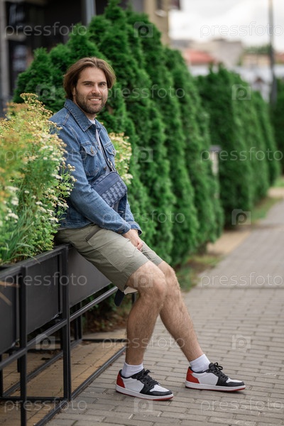 Улыбающийся мужчина в джинсовой куртке и шортах сидит на плантаторе, глядя в камеру