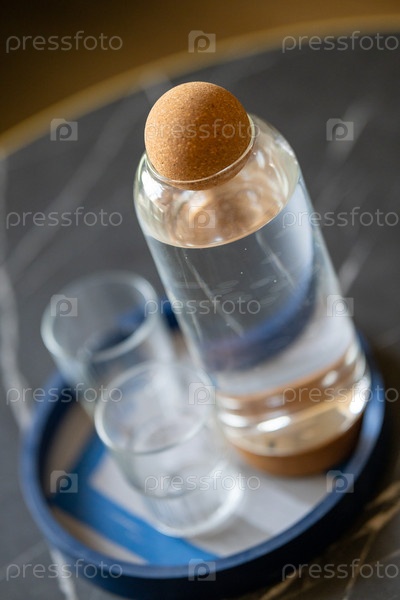 Стильная стеклянная бутылка с пробкой, заполненной чистой водой, сидит на подносе с двумя пустыми стаканами.Современная среда чистая и минималистичная, готова к освежающему напитку