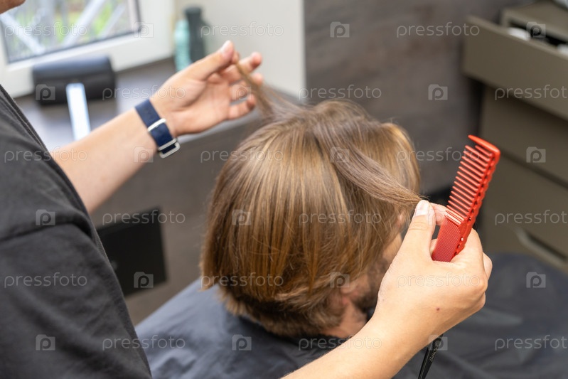 Парикмахер использует ножницы и гребень, чтобы подстричь клиента с длинными коричневыми волосами.Основной акцент делается на руках стилиста и стрижке в современном салоне