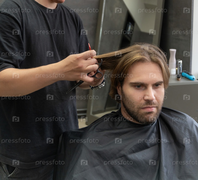 Мужчина в защитном плаще сидит на кресле парикмахера с серьезным выражением лица
