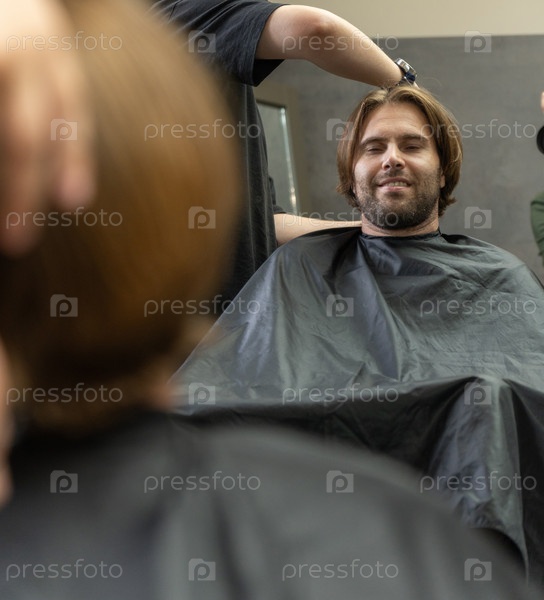 Бербер подрезает длинные коричневые волосы клиенту-мужчине в парикмахерском салоне.Мужчина сидит с нейтральным выражением лица, одет в черный плащ.Ображение видно слева
