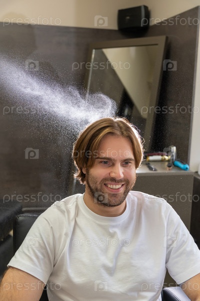 Парикмахер распыляет воду на волосы мужского клиента перед стрижкой