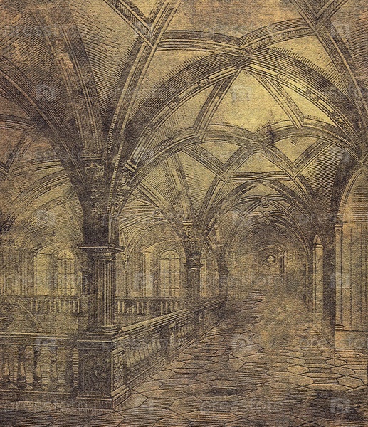 Готический сводчатый каменный коридор с винтажной гравюрой