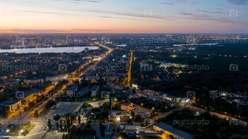 Липецк, Россия. проспект Мира. район левого берега. время после захода солнца. ночь, вид с воздуха