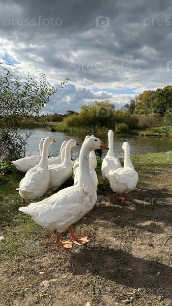 Домашние гуси пасутся у пруда в деревне