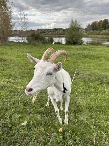 Белая домашняя коза пасется в лугу на зеленой траве