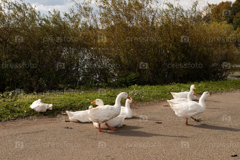 Домашние гуси пасутся у пруда в деревне