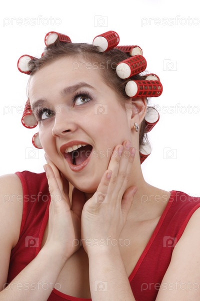 Молодая женщина с валиками для волос изолирована на белом