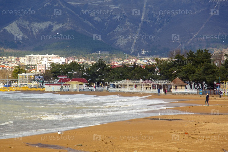 Шторм в Геленджике. штормовые волны прокатываются по песчаной поверхности Геленджика. набережная и балюстрада. Кавказские горы на заднем плане