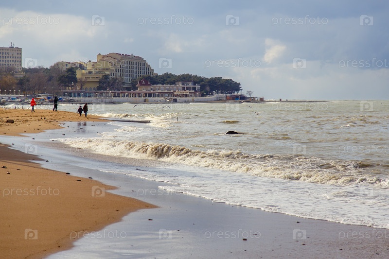 Шторм в Геленджике.Штурмовые волны прокатываются над песчаной поверхностью Геленджика.Люди, идущие по линии серфинга