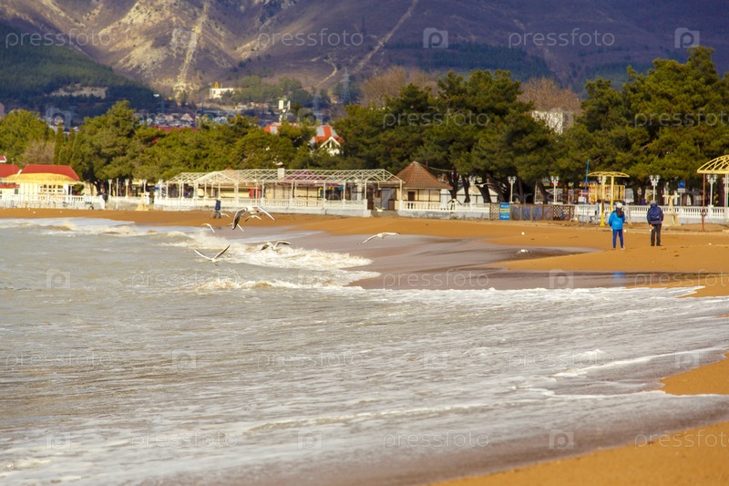 Шторм в Геленджике. штормовые волны прокатываются по песчаной поверхности Геленджика. набережная и балюстрада. Кавказские горы на заднем плане