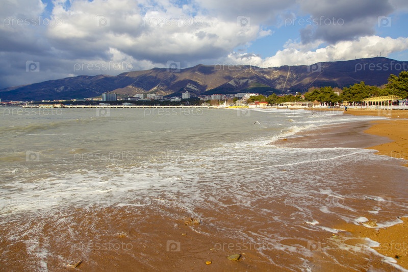 Шторм в Геленджике. штормовые волны прокатываются по песчаной поверхности Геленджика. набережная и балюстрада. Кавказские горы на заднем плане