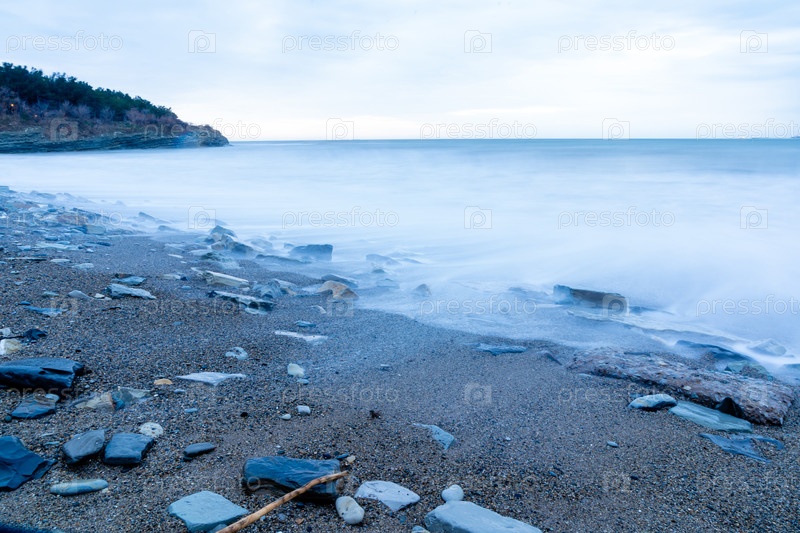 Шторм в Геленджике на длительном экспозиции.Волны в виде тумана врезаются в пляж Геленджика.Сумерки, закат