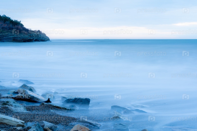 Шторм в Геленджике на длительном экспозиции.Волны в виде тумана врезаются в пляж Геленджика.Сумерки, закат