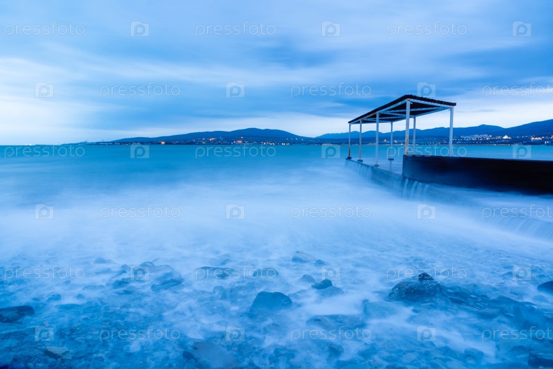 Шторм в Геленджике на длительном экспозиции. Волны в виде тумана врезаются в пляж Геленджика. Пирс. Сумерки, закаты солнца. Горы и городские огни на горизонте