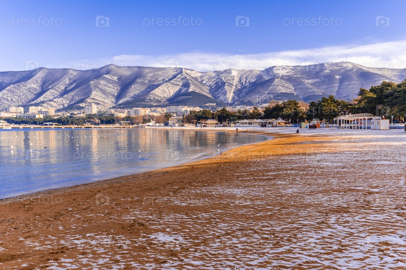 Берег Геленджик зимой, пляж со снежной горой на заднем плане