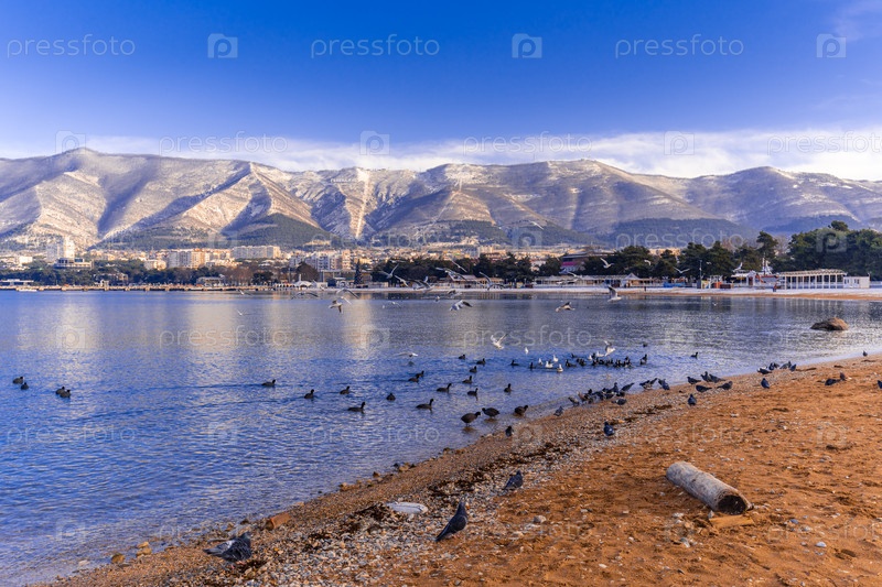 Пляж Геленджик зимой.Пляж с большим прудом и горным хребтом на заднем плане