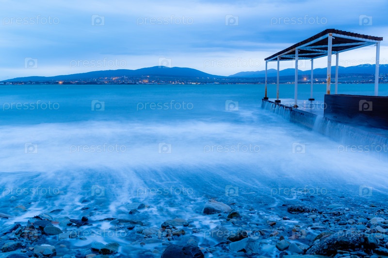 Шторм в Геленджике на длительном экспозиции. Волны в виде тумана врезаются в пляж Геленджика. Пирс. Сумерки, закаты солнца. Горы и городские огни на горизонте