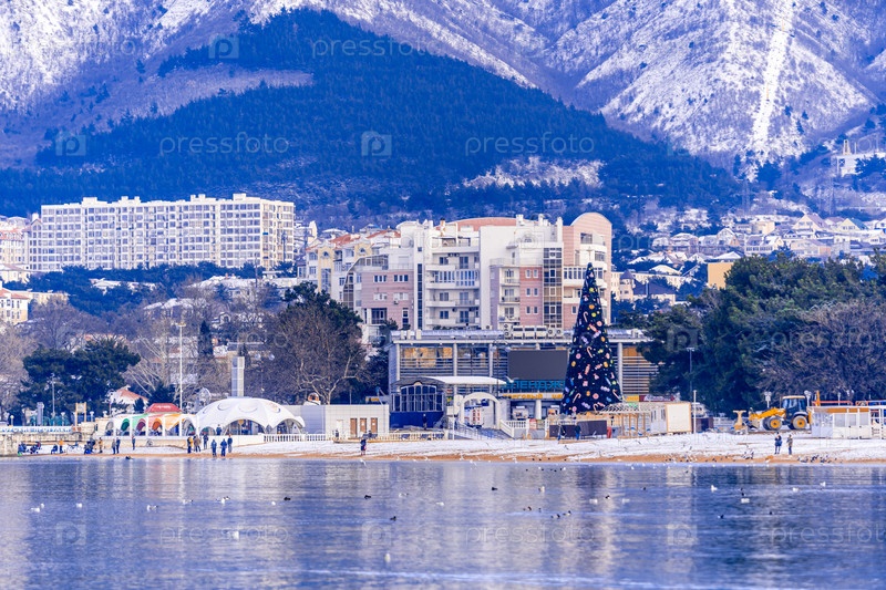 Курорт Геленджик зимой. Новогодняя елка на центральной площади курорта. Рождественская ёлка находится в центре города с большим количеством воды в баке