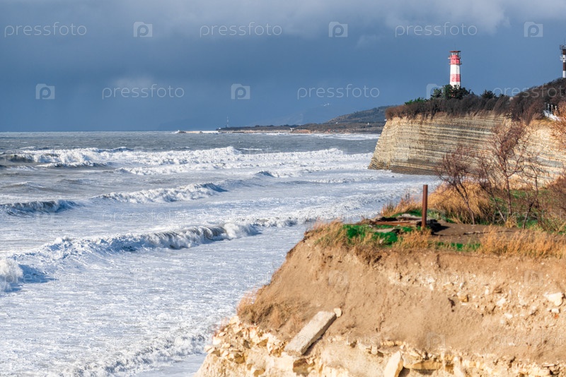 Геленджикский маяк стоит на высоком скалистом берегу. Сильный шторм в Черном море. Большие волны качаются по высокому берегу. Солнце светит сквозь облака