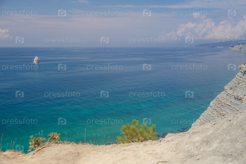Большая белая моторная яхта стоит возле крутого высокого скалистого берега. Сосны растут на вершине обрыва. Геленджик, Черное море. Спокойное и гладкое море