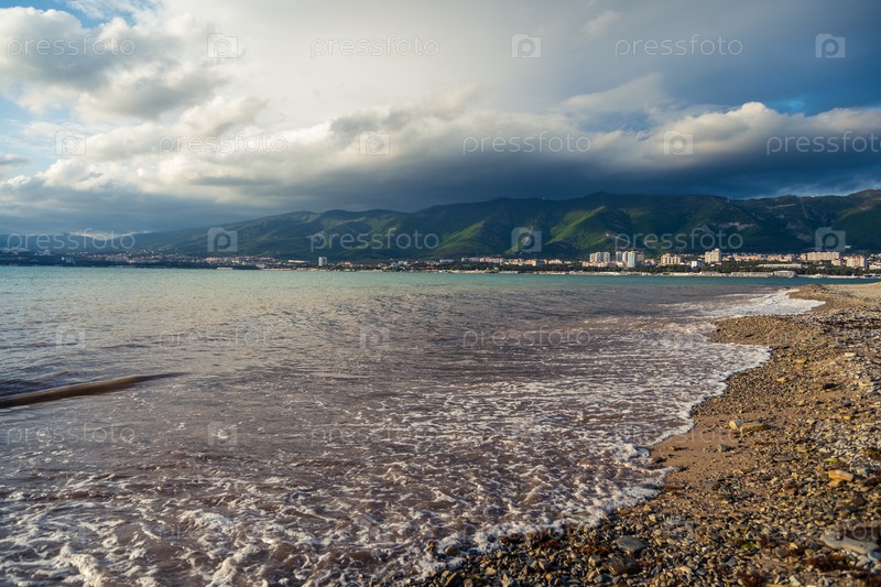 На заднем плане город Геленджик и Кавказские горы в облаках