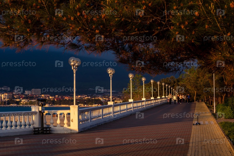 Курорт Геленджик. Набережная на закате. Балюстрада и набережная в наклоненных лучах заката солнца. Кавказские горы на заднем плане