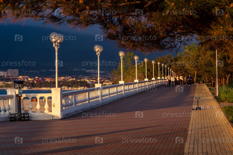 Курорт Геленджик. Набережная на закате. Балюстрада и набережная в наклоненных лучах заката солнца. Кавказские горы на заднем плане