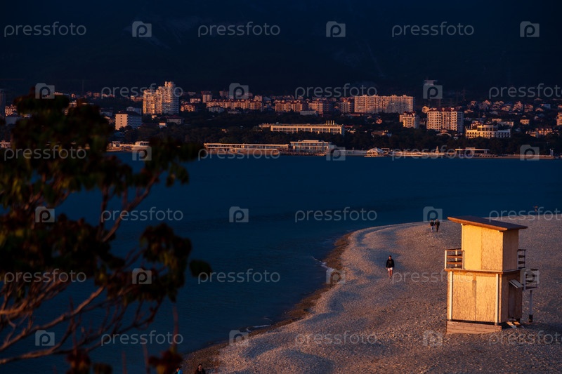 Курорт Геленджик. Пляж Геленджик Бухта на закате солнца. Люди гуляют по пляжу. Спасательная каюта на берегу