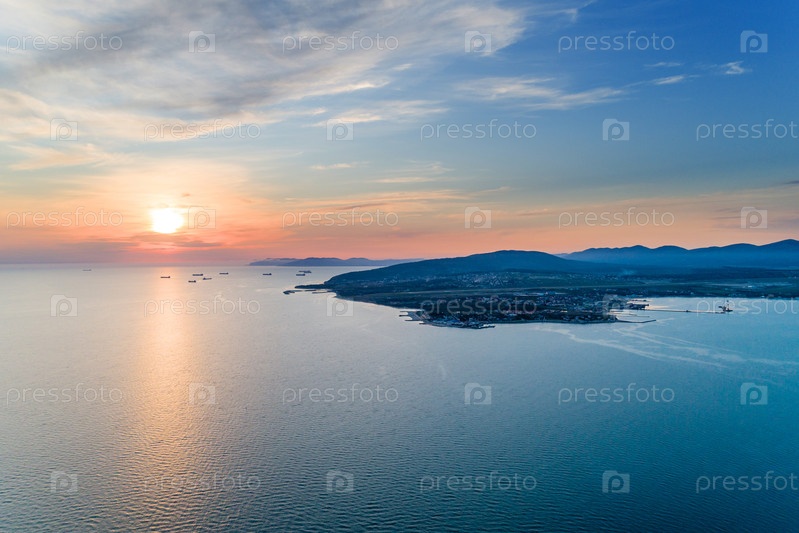 Геленджикский курорт на закате. Вид с воздуха Мы видим тонкий мыс и корабли, атакующие Новоосийск