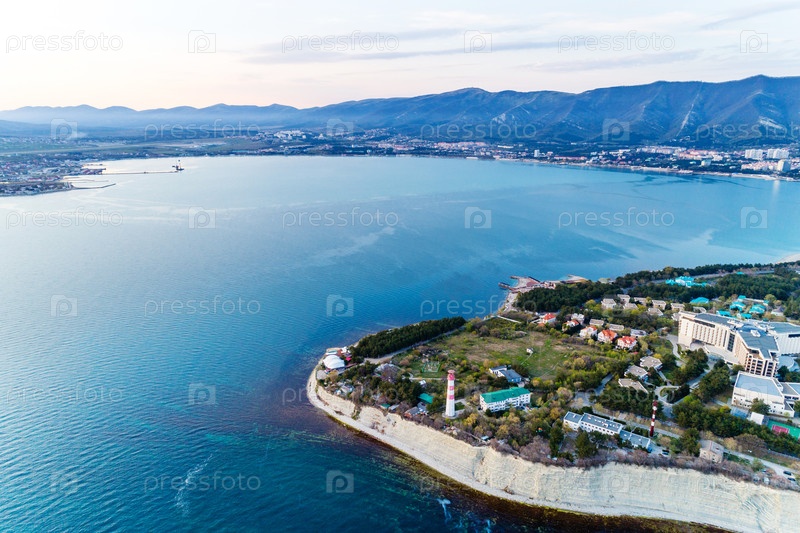 Скалистый мыс 'Толстой', курорт Геленджик.Закат солнца.Геленджикский маяк на скалистом берегу Куртома.Золотой залив и Кавказские горы в фоне.Вид с воздуха