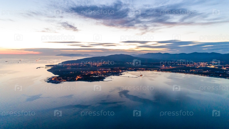 Курорт Геленджик. Вид с воздуха. Тонкий мыс и горы. На горизонте город Новороссийск