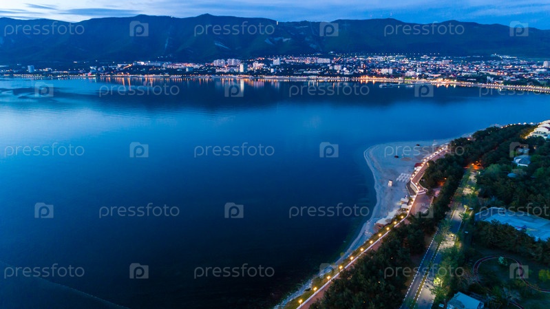 Геленджикский курорт. вид с воздуха. геленджикская бухта и набережная в вечернем сумерках