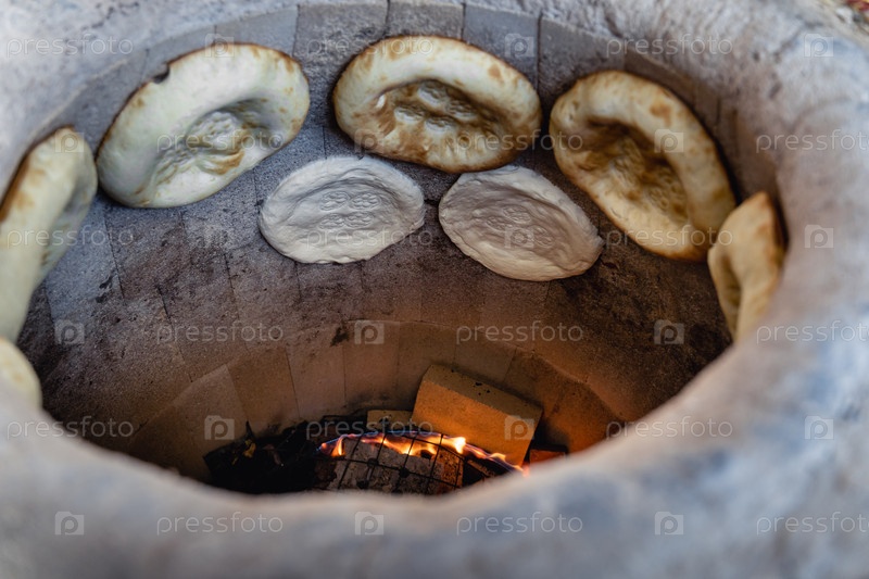 Узбекские лепестки свистят на сеновой тандуре и готовятся. Внизу горит огонь. Торты красные и сочные, с аппетитной корой