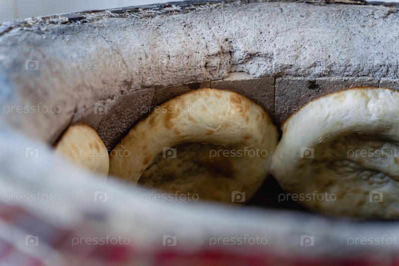 Узбекские лепестки свистят на сеновой тандуре и готовятся. Внизу горит огонь. Торты красные и сочные, с аппетитной корой