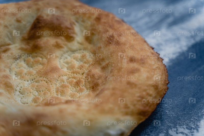 Свежевыпеченные аппетиты узбекские пироги лежат на столе, посыпаемые мукой