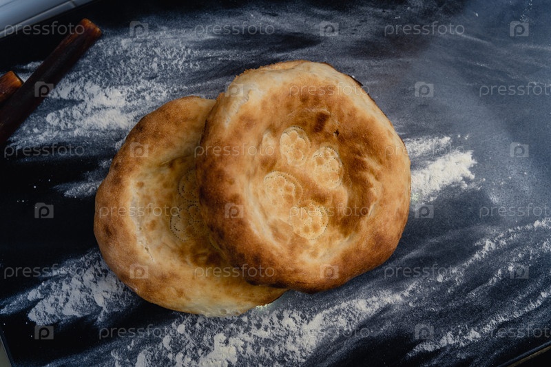 Свежевыпеченные аппетиты узбекские пироги лежат на столе, посыпаемые мукой