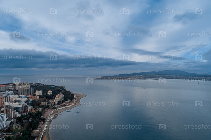Черное море, курорт Геленджик, мыс Толстой. вид с воздуха. зима. жилые районы мыса. маяк геленджика на вершине мыса