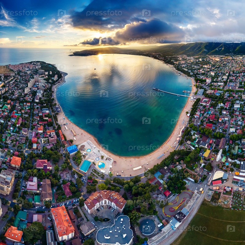 Панорама Геленджика и Геленджикского залива при закате солнца Солнце и облака отражаются в голубой воде геленджикской бухты Центральный пляж на переднем плане