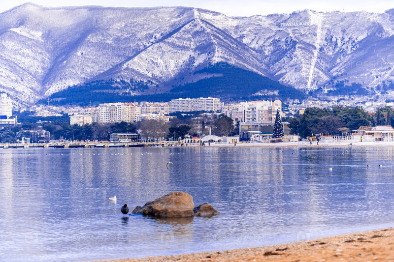 Зима на курорте Геленджик. Кавказские горы в снегу. Скалистое побережье с птицей в воде и городом на заднем плане