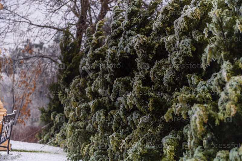 Геленджикский курорт зимой, парк после морозного дождя.Снежное дерево с скамейкой на заднем плане