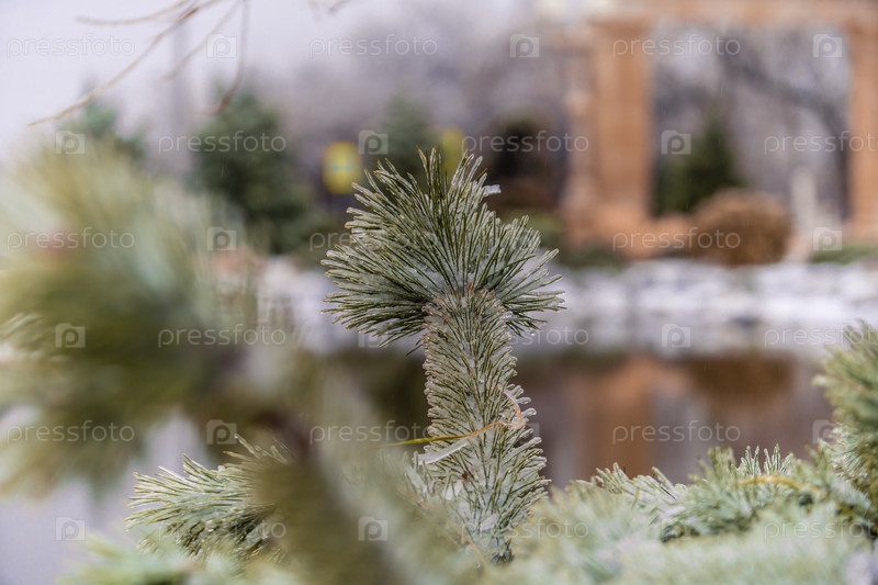 Геленджикский курорт зимой, парк после морозного дождя. дерево со снегом и здание на заднем плане
