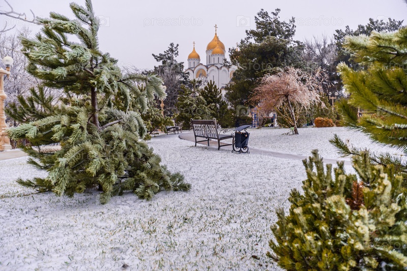 Курорт Геленджик зимой, собор Святого Андрея после морозного дождя.Заснеженный парк с скамейкой и упавшим деревом