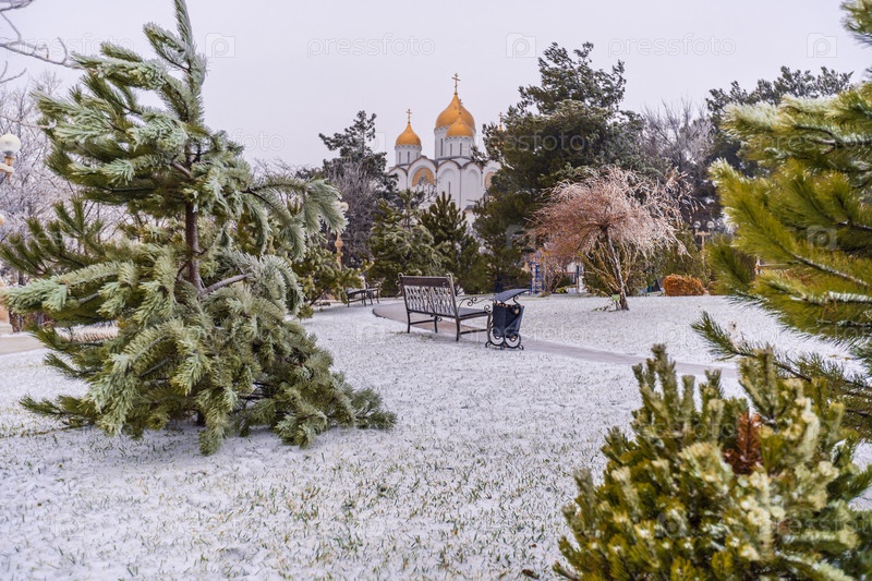 Курорт Геленджик зимой, собор Святого Андрея после морозного дождя.Заснеженный парк с скамейкой и упавшим деревом