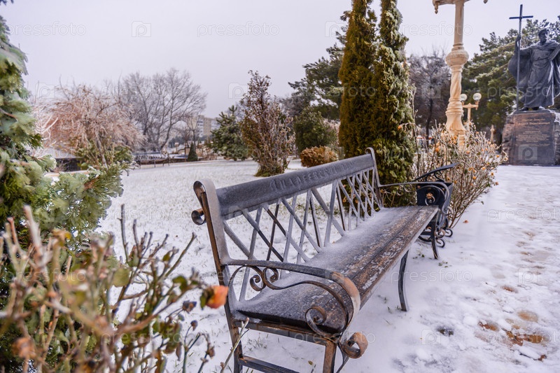 Парковая скамейка и все растения покрыты слоем льда