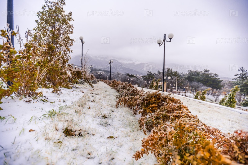 Геленджикский курорт зимой, парк после морозного дождя. снежная дорожка с рядом деревьев и несколькими огнями