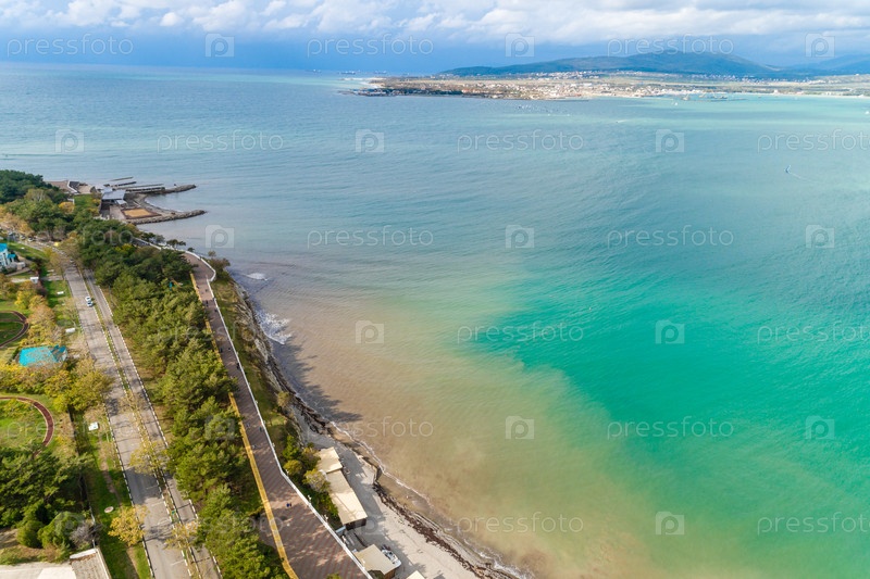Курорт Геленджик. мыс 'Толстый' и вход в залив Геленджик. красивая зеленая вода Черного моря. на мысе 'Тольстой' маяк Геленджик и гостиницы. вид с воздуха